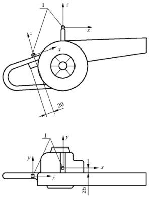 5.5.1.2 在不影响正常握持手把的前提下,加速度计的安装位置应靠近操作者的手部。加速度计的安装位置和测量方向见图1。